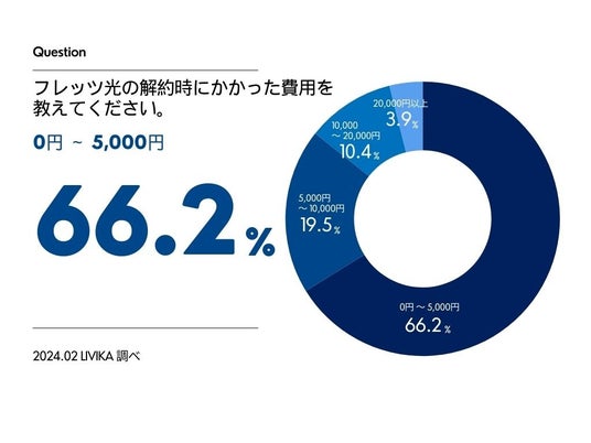 フレッツ光の解約時にかかった費用が、「0 ~ 5,000円」(66.2%)が過半数を占めることが今回の調査で明らかになりました。次いで、「5,000円 ~ 10,000円」が19.5%となっており、10,000円以下が相場と考えられます。