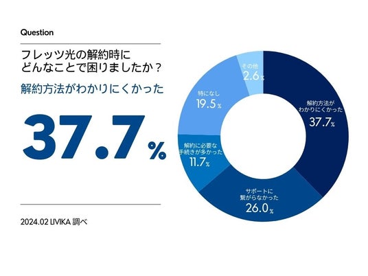 フレッツ光の解約時に困ったことについて、最も多くの方が挙げたのは「解約方法が分かりにくかった」(37.7%)となりました。次いで多かった回答は、「サポートに繋がらなかった」が26.0%、「解約に必要な手続きが多かった」が11.7%となりました。