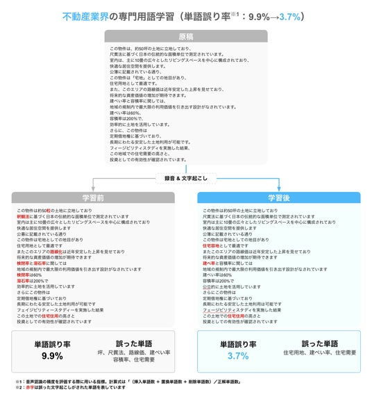 以下は、不動産業界と金融業界の専門用語を盛り込んだ音声の文字起こしを、学習前と学習後で比較した結果になります。