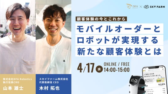 DXを推進するロボティクスソリューションカンパニーである株式会社DFA Robotics(本社:東京都渋谷区、代表取締役社長:波多野昌昭、以下「DFA Robotics」)と、施設特化型モバイルオーダーシステム「NEW PORT」を運営するスカイファーム株式会社(本社:神奈川県横浜市 代表取締役:木村 拓也)は、商業施設やホテル向けに人手不足と顧客体験を向上させるDX施策について、2024年4月17日(水)14:00から参加無料の共催ウェビナーを開催いたします。