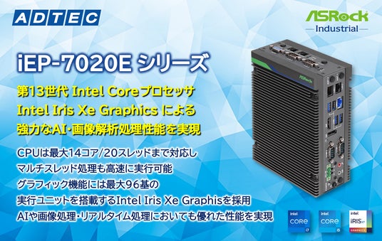 今回発売する新製品「iEP-7020Eシリーズ」は、第13世代 Intel(R) Core(TM) プロセッサ(Raptor Lake-P)とIntel(R) Iris(R) Xe Graphicsによる強力なAI・画像処理性能を実装した産業用エッジコンピュータとなります。