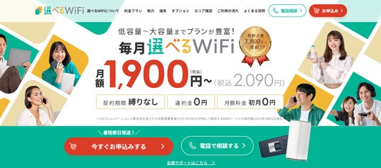 「選べるWiFi」は、下り最大4.2Gbpsの高速通信で0GBから無制限まで豊富なプランを提供するポケット型WiFiです。通信容量のプランを毎月選択することができるので、通信費の削減を実現することができます。また、使わない月は0GBをはじめとした低容量のプランを選択することができる*1ため、使いすぎの防止や、複数台契約の場合に使わない機種を選択して経費削減につなげることができます。回線はKDDIの回線を利用しているため、安定・高速な通信を実現しています。契約期間の設定がないため、不要になったらいつでも解約することが可能です。また、カスタマーサポートの営業時間は午前11時から翌午前0時まで開いているため、多忙な方でも不明点があればいつでも問い合わせできます。