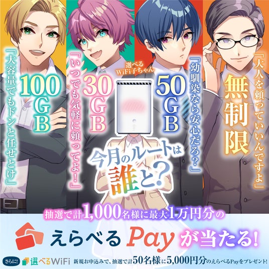 通信回線や電力などのインフラを中心とした商品・サービスを提供している株式会社ALL CONNECT(読み:オールコネクト、代表取締役社長:岩井 宏太、本社:福井県福井市)のグループ会社、株式会社ディーナビ(代表取締役:安達 梨加、本社:大阪府大阪市)は、選べるWiFiの「えらべるPayがあたる景品総額100万円のWチャンスコラボキャンペーン」を2024年3月22日(金) より実施いたします。