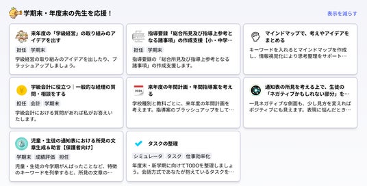 2024年3月現在、学期末・年度末の先生を応援!という特集で、簡単に生成AIを使える逆引きモードをラインナップ。新年度の「学級経営」のアイデアを出したり、指導要録をまとめるサポートを行ったり、新年度の年間計画などの立案を支援します。