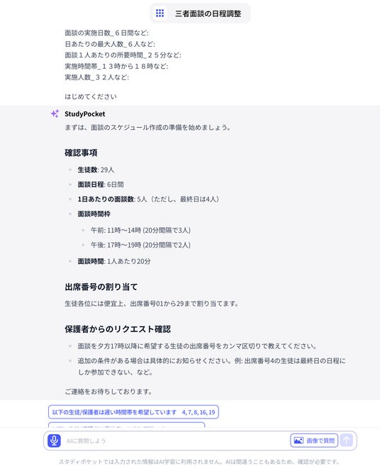 逆引きモードでは「三者面談の日程調整」など様々な校務支援の機能を、プロンプト入力なしで可能としています。
