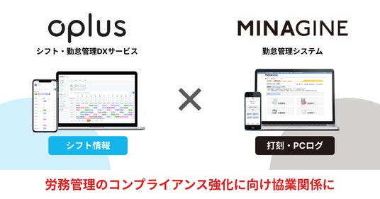 シフト・勤怠におけるDXと労務におけるコンプライアンス強化を共に推進すべく、「oplus」とミナジンが提供する勤怠管理システム「ミナジン勤怠管理」とのデータ連携、および販売協力を今後進めていく予定です。