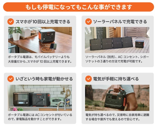 地震や台風など、大きな災害が相次ぐ中、突然起こる災害に備えて日頃から防災用品を準備しておくことが大切です。Jackeryのポータブル電源やソーラーパネルは、日常的使いにも申し分ないスペックながら、電源が必要となる停電などの非常時にも大きな力を発揮する商品です。