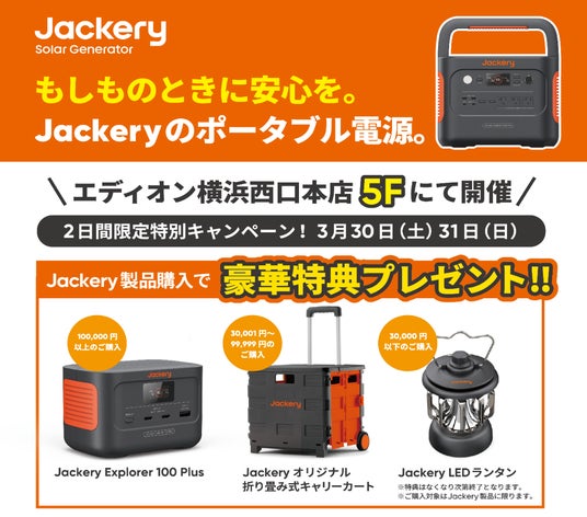 ポータブル電源・ソーラーパネルの世界的リーディングカンパニー・Jackery(ジャクリ)の日本法人である株式会社Jackery Japan(本社:東京都港区)は、3月30日(土)、31日(日)の2日間限定の特別キャンペーンをエディオン横浜西口本店にて開催いたします。本キャンペーンでは、Jackery製品のご購入額に応じて、手のひらサイズの小型ポータブル電源「Jackery Explorer 100 Plus」をはじめとする豪華な賞品をプレゼントします。