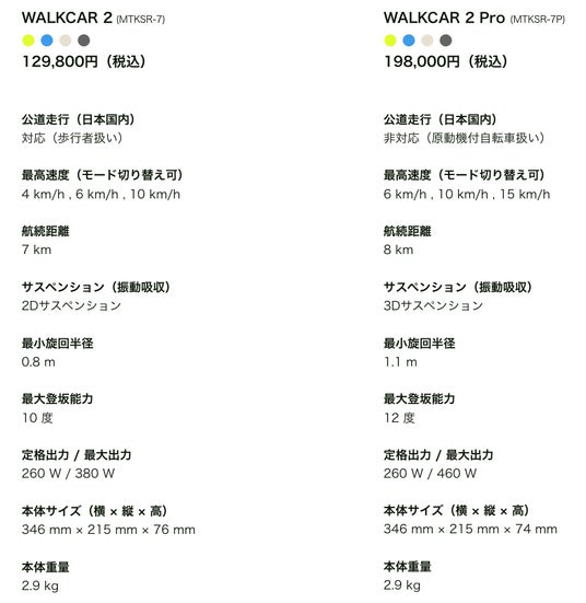 WALKCAR 2 / WALKCAR 2 Proの違い