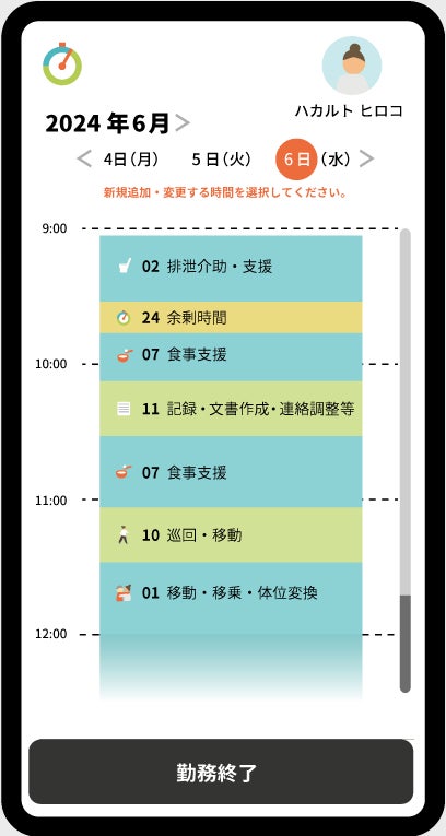 - 生産性向上推進体制加算及び特定施設等における人員配置基準の特例的な柔軟化で要求される様式において、余裕時間や移動時間の入力が求められており、ハカルトはこれらの時間を自動的に抽出・確認できる機能を開発中です。
