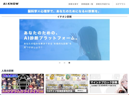 AI-KNOWは、誰もが診断を投稿していける、心理診断プラットフォームです。その多くは個別の専門家によって作成された、とても役にたつ診断となっております。
