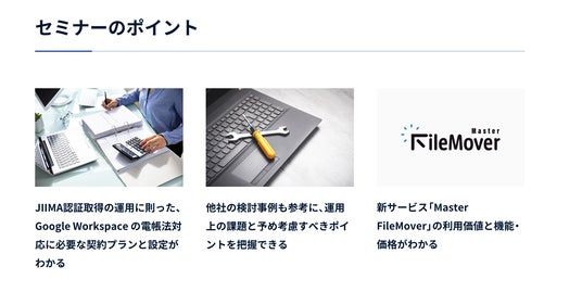 また、Google Workspace による電帳法対応を検討する企業のニーズを基に独自開発した、新サービス「Master FileMover」の概要や導入メリットをご紹介します。