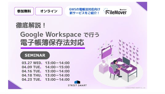 企業や教育機関のDXを支援する株式会社ストリートスマート(所在地:大阪府大阪市北区、代表取締役社長:森田竜次、以下:ストリートスマート)は、Google Workspace で行う電子帳簿保存法対応(以下、電帳法)の無料セミナーを開催します。