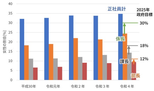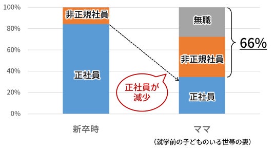 第5次男女共同参画基本計画では、民間企業の係長相当職に占める女性の割合を2025年までに30%にする目標を掲げています。そのためには、現在は35%にとどまる、正社員に占める女性の割合を増やす必要があります。就学前の子供を持つ女性の66%を占める専業主婦やパートタイマーが正社員となることは、管理的地位にある女性を増やすことに繋がります。
