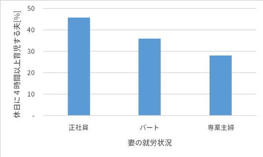 日本の夫の育児参加は未だ非常に低いことが指摘されています。2020年全国家庭動向調査によると、平日の夫の育児時間は妻の就労状況に関わらず少ないですが、休日に4時間以上育児をする夫の割合は、妻が無職の場合は25%であるのに対し、妻が正社員の場合は45%と、1.8倍となります。正社員の妻が増えることで、夫が育児参加する流れを加速できます。