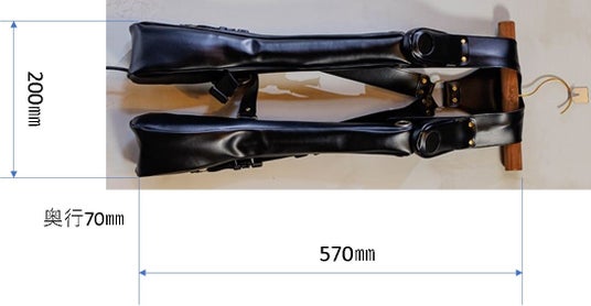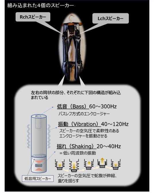 ハーネスの取り回し方、左右の低音振動部の形状や材質の選定、これらを組み合わせることで、上半身の広い範囲にわたって、適切な大きさの振動と揺れを伝えます。