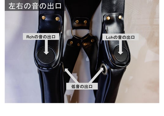 fuiigoを身に着けた時、左右の胸からお腹にかけて密着する筒状の部分には低音用のスピーカーが内蔵されており、低音とともに振動と揺れを発生します。