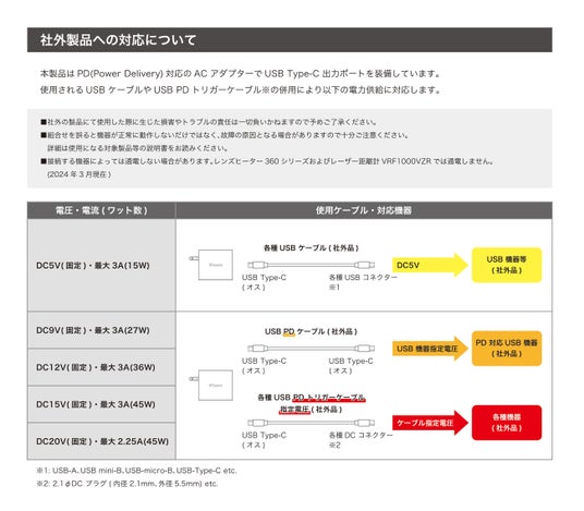 市販のUSBケーブル、USB PDケーブルおよびUSB PDトリガーケーブル等の併用により一般機器の電源や充電器として電力を供給できます。