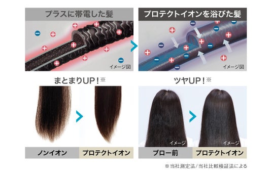 プロテクトイオンは、マイナスイオンとプラスイオンを同時に放出し、それぞれのイオンが髪に働くことで、髪の広がりや傷みの一因となる静電気を抑制し、髪のツヤやまとまりをアップします。「TD360A」は、これまでにプロテクトイオンを体験されたことのなかったお客様や、ヘアドライヤーの新調をお考えのお客様に是非手に取っていただきたい、コストパフォーマンスに優れたモデルです。
