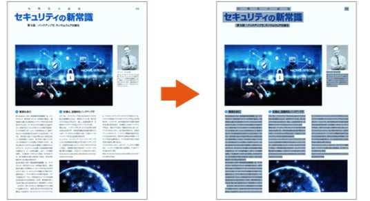 検索可能な透明テキスト付きPDFファイルを作成できます。画像中の文字をテキストデータ化し画像の上に透明な状態で配置。後からキーワードで検索したり、テキストをコピーして活用したりする時に便利です。
