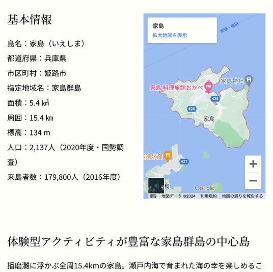 島図鑑日本における有人離島の情報を簡潔に紹介するページを作成しています。一目で島の概要を掴むことができるコンテンツとすることを目指しております。
