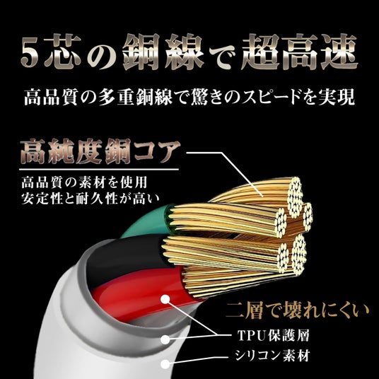 一般的なUSB充電ケーブルは、おおよそケーブル直径が3mm程のものが多い中、本製品は5mm。