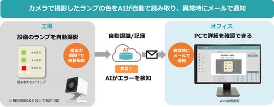 今回のアップデートでは、幅広い工場設備で使用されている「ランプ」に着目。固定カメラで定期的に撮影したランプの色をAIで認識し、事前の設定に基づいて設備の稼働状況(正常/異常)を判定します。異常を検出した時には直ちにメールでお知らせするので、これまで発見や対処が遅れがちだった離れた場所にある設備の異常も、現場へ行かずに検知できるようになり、すばやく適切な対処が可能になります。また、アナログ、デジタルの各種メーターとランプを同時に読み取ることも可能ですので、点検業務のさらなる効率化が図れます。