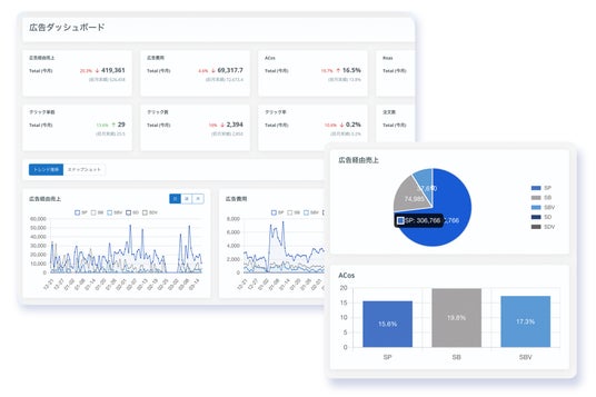 Amazonのスポンサープロダクトの過去からのパフォーマンスを、広告タイプごとに把握し分析する事が可能です。広告のパフォーマンスをデータに基づいて即時改善することをサポートします。