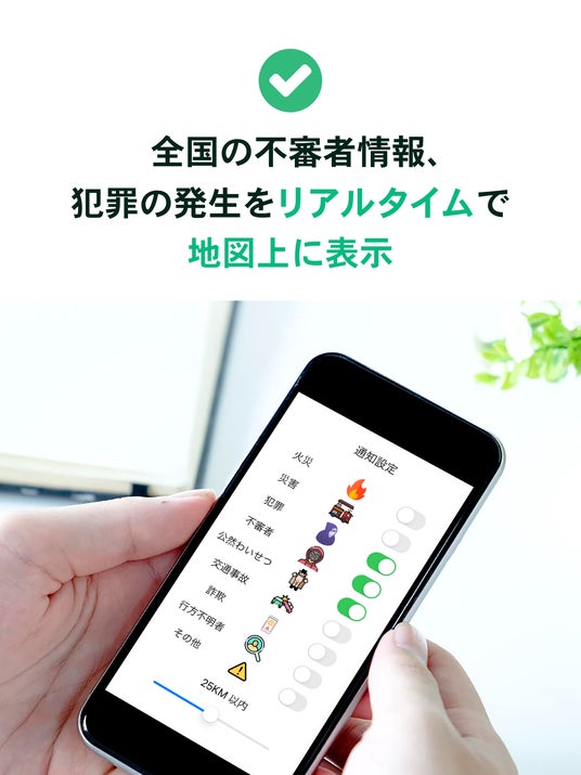また、地図表示機能、通知機能ともに、得たい情報のカテゴリをカスタマイズすることで、必要な情報のみを得ることが可能です。さらに、地図表示機能は最大過去48時間以内に発生した事案のみを表示可能、また、通知機能は、通知を受けたい事案の発生場所の現在地からの距離を指定可能となっており、ニーズに合わせた情報を受け取ることが可能です。