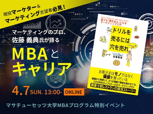 留学不要、完全オンラインで米国MBA(経営学修士)を取得できる「マサチューセッツ大学MBAプログラム」事務局は4月7日に『ドリルを売るには穴を売れ』『白いネコは何をくれた?』等有名著書を多数執筆された、佐藤 義典氏をゲストに迎え、マーケターとしてのキャリアパスとMBAについてお話を伺うイベントを開催します。