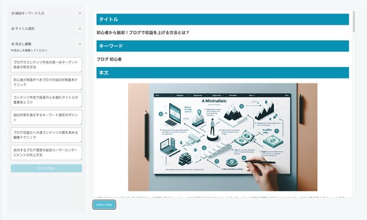 ブログ記事の作成、記事の内容に合致した画像の生成、生成された記事の編集、記事の文字数選択*、テーマごとの記事生成*など、豊富な機能を備え幅広いニーズに対応します。(*は順次公開予定)