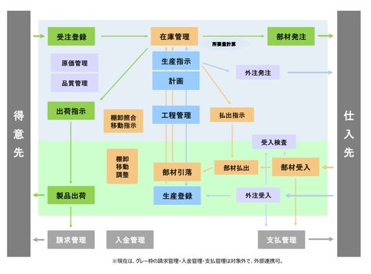 在庫管理、工程管理、生産計画、受発注管理、原価管理、品質管理、設備管理など
