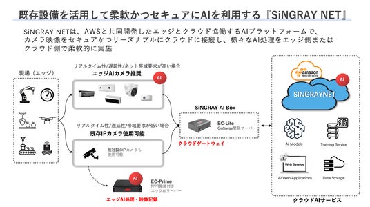 既存のインターネットカメラ(IPカメラ)を、当社が提供する「Edge Clouding AI Box」と接続することにより、撮影映像から必要な画像を切り出し、クラウド上のAI処理を可能とします。従来のサービスでは、エッジ側もしくはクラウド側のどちらかにAI処理のウエイトを置いたものが多く展開されていました。当サービスでは、エッジとクラウドが相互補完し、両者のメリットが協働するよう構築し、、導入・設定に係る費用及び時間をフルカスタマイズ開発のAIサービスに比べ大幅に縮小しました。また、AWSと共同開発した当サービスはオープンソースのAIモデル活用が容易で、導入時にかかる費用及び時間を大幅に低減し、AI導入のハードルを下げました。