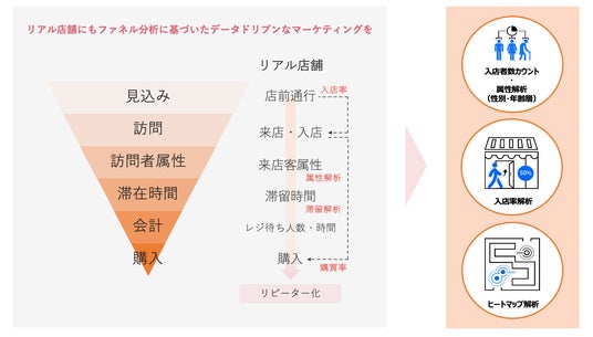 このコンセプトでリリースした小売・サービス業向けの『StoreSense』では、顧客属性解析サービスと店前通過から購買までの購買行動分析(ファネル分析)サービスを提供し、最適な店舗オペレーション構築をサポートすることで、「カスタマーエクスペリエンスの向上と来店客数の増加」の実現を支援します。また、レジ待ち解析、遠隔巡視サービス及び欠品通知サービスの開発も進行中であり、これらのサービスを複合化することで、売上・サービス向上から店舗運営の効率化までをワンストップで推進します。