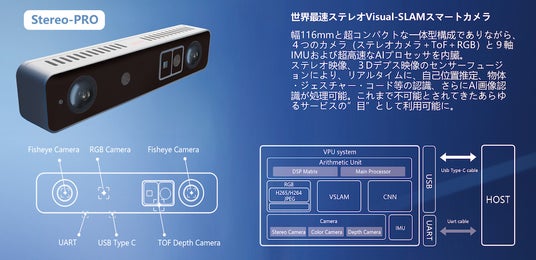 『SiNGRAY StereoPro』は、ステレオカメラに加え、リーズナブルなレーザーセンサのToF、カラーセンサー、AIプロセッサ及び、上下前後左右の動きを把握するIMUプロセッサをコンパクトに一体化しています。これらのセンサの一体化(センサフュージョン)により「Vision-based Navigation Software」に必要とされる外光環境への順応性や高速処理・同時処理を実現しています。