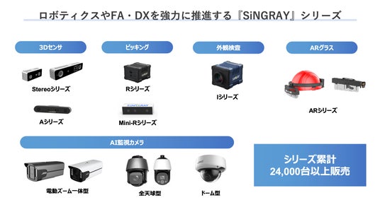 福岡で2018年の創業後リリースした当シリーズは、VSLAMモジュール『SiNGRAY Aシリーズ』 を皮切りに、ロボットピッキング用カメラ、外観検査用カメラ、ARグラスとラインナップを広げ展開しています。各種産業用及び家庭用ロボットや無人搬送車(AGV)、工場内自動検査設備に視覚センサとして使用され、シリーズ累計24,000台以上の販売実績を誇ります。