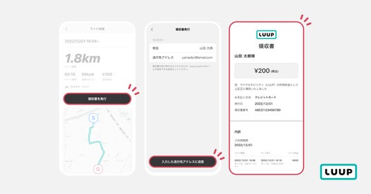 「LUUP」では、ライド履歴画面から領収書を発行することが可能です。宛名とメールアドレスを入力いただくことで、対象ライドの領収書が送信されます。オフィスまでの通勤や営業先への移動など、仕事中の移動手段としてご利用いただく際に、ぜひご活用ください。なお、会社によっては労災の観点から認められない可能性もあります。ご自身で会社に確認の上、ご利用いただくようお願いいたします。