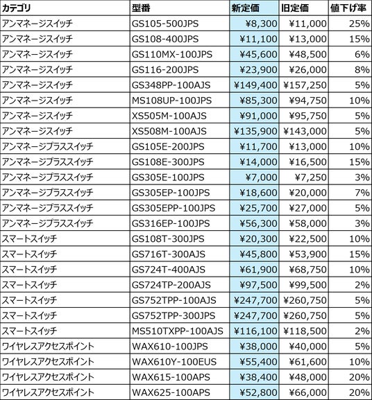 ネットギアジャパン合同会社(所在地:東京都中央区、代表:杉田 哲也、以下NETGEAR)は、法人向け製品のアンマネージスイッチ、アンマネージプラススイッチ、スマートスイッチ、アクセスポイントの24機種を、最大25%値下げする価格改定を発表します。当社の供給体制の効率化によりコスト削減を行い、それによりお客様に還元することが可能になりました。今回の価格改定は本日より実施し、今までよりもさらにお客様の手に届きやすい価格帯に変更することにより、日本市場におけるシェア拡大を目指します。