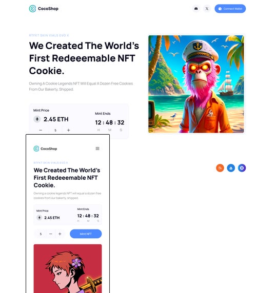 CocoShopはノーコードでNFTの作成からNFTミントサイト、マーケットプレイスの構築を行うことができるプラットフォームです。NFTの作成からNFTミントサイトの構築までをクローズドβ版で提供します。