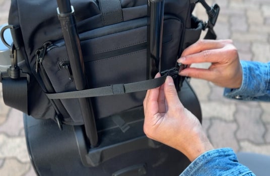 バッグの背面側で繋ぐストラップは、キャリーバッグホルダーとして早変わりし、旅先での移動も快適です!
