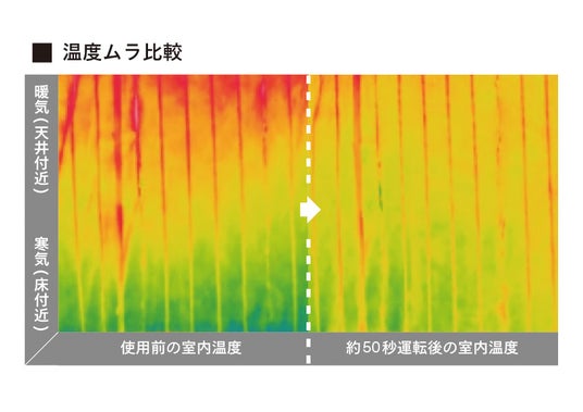 ※2 当社調べ: [試験条件]部屋の広さ8畳、最大風量(サーキュレーションモード)にて運転。なお、空気が撹拌された状態を保つために継続的に運転することをおすすめします。