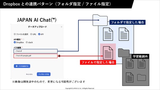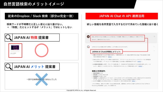 JAPAN AI株式会社(本社:東京都新宿区、代表取締役社長:工藤 智昭、以下JAPAN AI)は、法人向けChatGPT「JAPAN AI Chat((TM))」が、API連携を通じてDropbox内のファイルと、Slackのチャット情報を学習可能になったことをお知らせいたします。