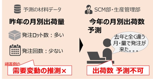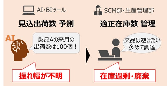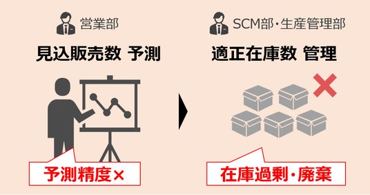 営業部からSCM部に連携される見込販売数は、去年同月の出荷実績データをほとんどそのまま引用し作成されているため低精度でした。SCM部はこの精度の低いデータをもとにして適正在庫数の更新を行うため、無駄な余剰在庫の管理コストや消費期限がある商品の廃棄による損失が発生していました。