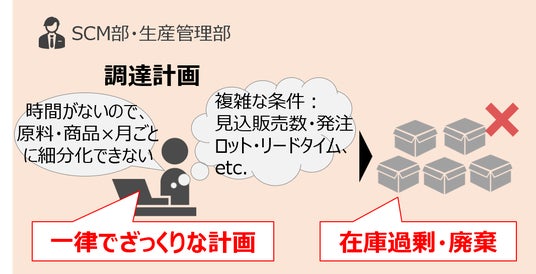 しかし、実際には時間の制限から困難で、 在庫月数を一律2か月に設定したり、過去の出荷実績から単純計算で品切れにならない在庫数を算出するなどの方法が運用上の限界となっています。その結果、余剰在庫や廃棄によるコストの削減ができていません。
