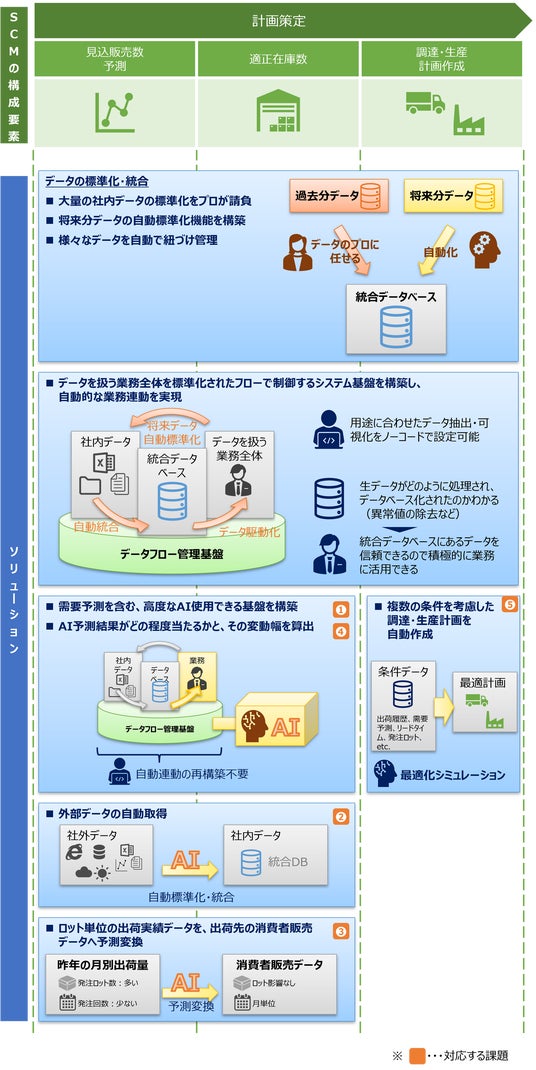 最適な生産計画作成や関連するデータフローを、まとめて自動化・コントロールする“データフロー管理基盤”を構築し、成果として売切30%削減、廃棄損失70%削減を実現した。