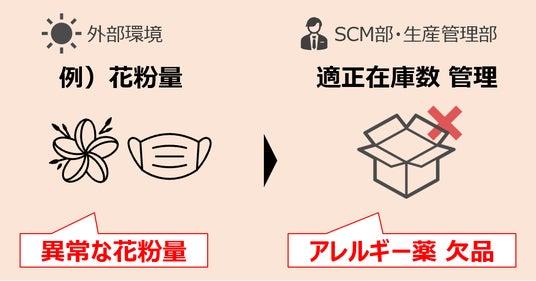 ある年に、例年と比べて花粉の量が異常に多くアレルギー系の医薬品の需要が急激に高まったことにより、大量の追加発注がありました。これに対し調達・製造が間に合わず、在庫不足による多大な遺失利益、小売店への保障費用が発生しました。他にも異常気象・災害・流行り・認知度など、さまざまな外部環境変化への対応が後手になることで損失が発生しています。