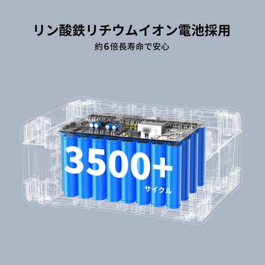 - 6倍の長寿命化リン酸鉄リチウムイオンバッテリーを搭載したEP3000-48Vは、充放電サイクル3,500回後も残存量は80%以上を維持、従来三元系バッテリーを使用したポタ電の約6倍の長寿命が実現しています。