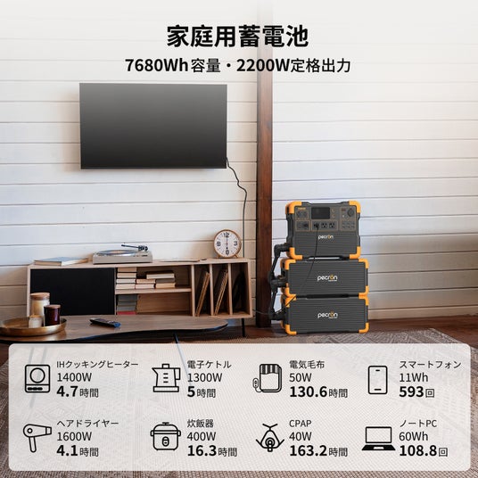 - ほとんどの家電を動かせE1500LFPと2台のEP3000-48Vを接続すれば、容量が7680Whまで拡張することができます。しかも、AC出力2200Wと高出力なので、冷蔵庫や洗濯機などの大型家電や、扇風機、電気毛布なども長時間稼働させることができる。
