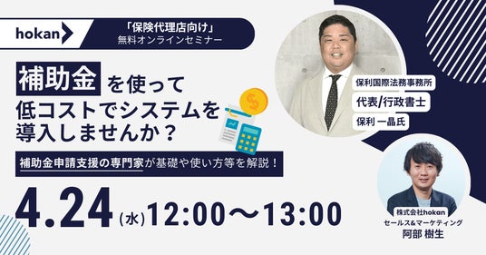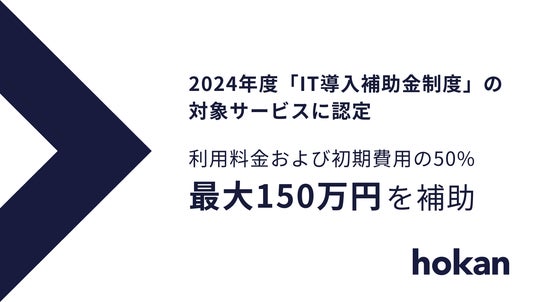 株式会社hokan(ホカン、本社:東京都中央区、代表取締役:小坂直之、以下:当社)は、経済産業省が推進する「IT導入補助金2024」のIT導入支援事業者に採択され、当社が提供する「適正な営業活動」と「組織の強固な監査体制」を実現するクラウド型保険代理店システム「hokan(R)」が「IT導入補助金2024」の対象サービスに認定されたことをお知らせいたします。この制度は「hokan(R)」をこれから導入いただく保険代理店が、中小企業・小規模事業者に該当し、審査を経て適用された場合に、2年間分の「hokan(R)」月額利用料金および初期費用の最大1/2の金額(最大150万円まで)を補助金として受け取ることができる制度です。