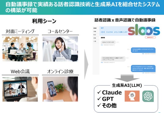 当社のコア技術である話者認識APIの「VDQore」は、10秒程度の音声から個人を特定し、既存の音声認識と組み合わせることで「誰が何を話したか」をリアルタイムに可視化します。この技術は既に累計約2,600社提供の自動議事録サービス「Sloos」にも採用されています。